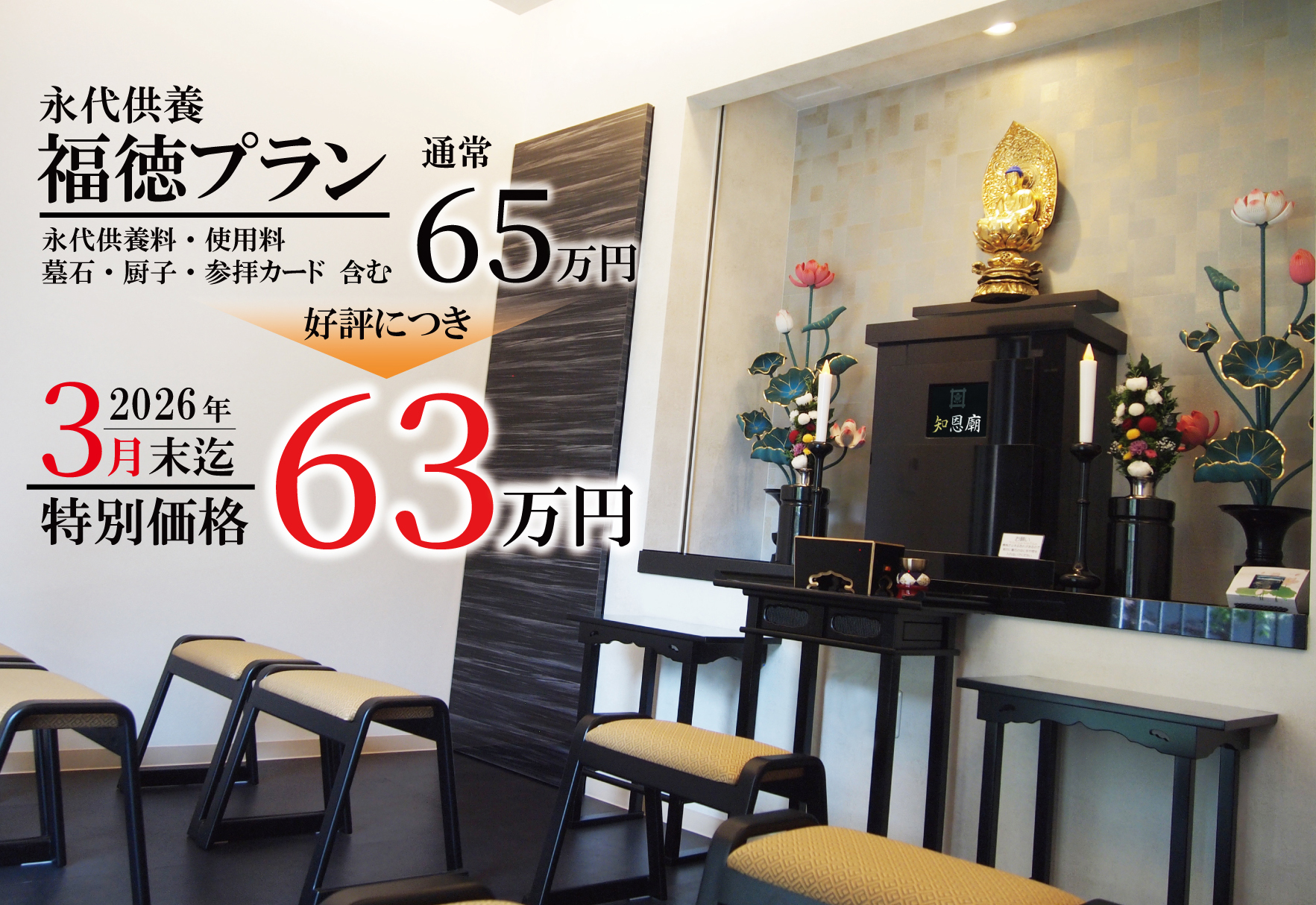 永代供養付納骨堂知恩廟の福徳プランは、通常65万円ですが、ご好評につき2026年3月までの特別価格として63万円となっております。